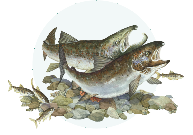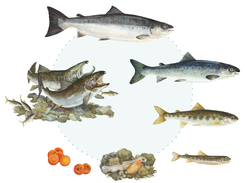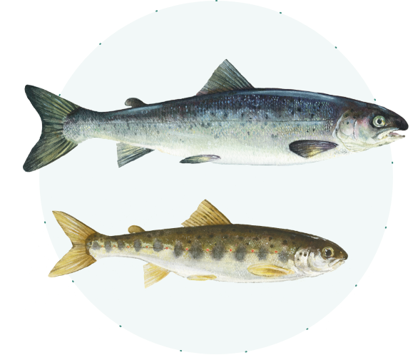 Wild Atlantic salmon are capable of incredible bursts of speed while hunting. In the ocean, they develop needle-sharp teeth that grab and hold prey. Capable of diving over 900 metres (3,000 feet), wild Atlantic salmon consume deep sea creatures as well as small fish that school closer to the surface. Under the right conditions, a salmon smolt weighing 30 grams leaving freshwater can return two or three years later as an adult weighing more than 25 kilograms (55 pounds).