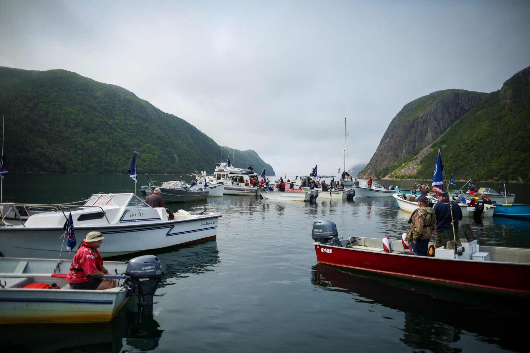 Boats from Burgeo and Ramea gather in Bay d’Loup, Newfoundland and Labrador, in opposition to salmon farm expansion in the area. Photo ASF/Dru Kennedy