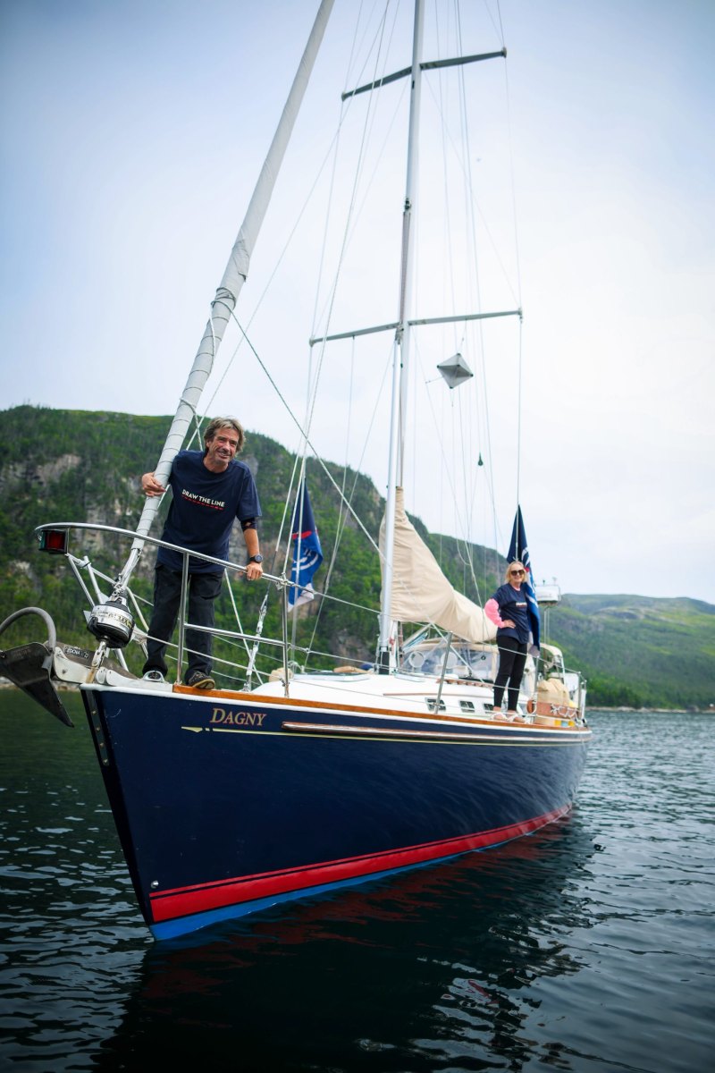 BURGEO, NL – 30 boats and more than 100 people took part in the “Draw the Line” boat rally on Sunday, August 10th, to oppose salmon farm expansion in Newfoundland and Labrador. People came from Ramea and Burgeo, meeting in Bay de Loup, one of the south Newfoundland fjords targeted for salmon farm expansion.