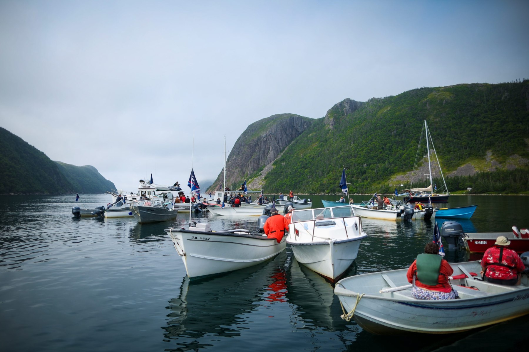 BURGEO, NL – 30 boats and more than 100 people took part in the “Draw the Line” boat rally on Sunday, August 10th, to oppose salmon farm expansion in Newfoundland and Labrador. People came from Ramea and Burgeo, meeting in Bay de Loup, one of the south Newfoundland fjords targeted for salmon farm expansion.